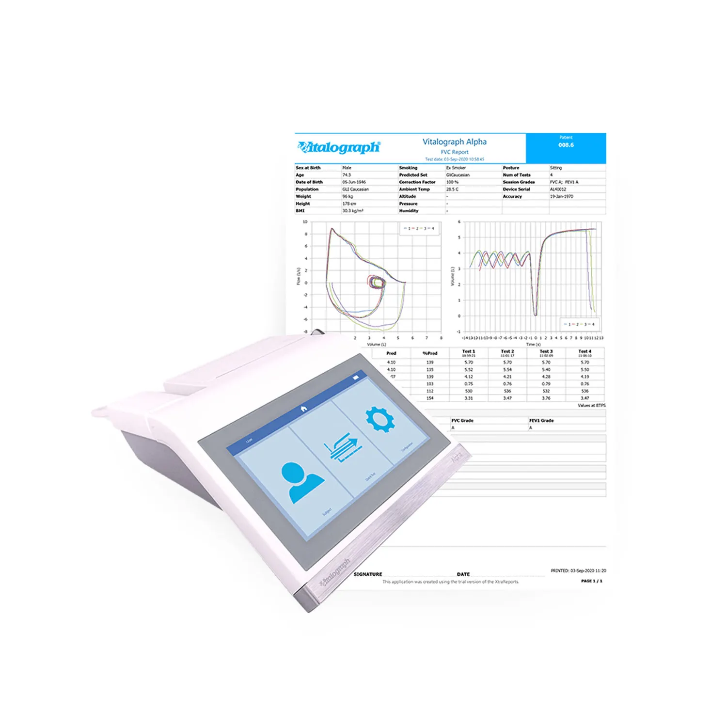 מכשיר ה-Vitalograph ALPHA Connect הוא ספירומטר שולחני ונייד (All-in-One) המופעל באמצעות סוללה נטענת. הוא תוכנן במיוחד לעמוד בסטנדרטים המחמירים ביותר של ATS/ERS-2019 ומצויד בטכנולוגיית מדידה מתקדמת המבטיחה תוצאות מדויקות ואמינות. המכשיר כולל מסך מגע גדול לתפעול אינטואיטיבי ומדפסת תרמית מובנית להפקת דוחות מיידית.